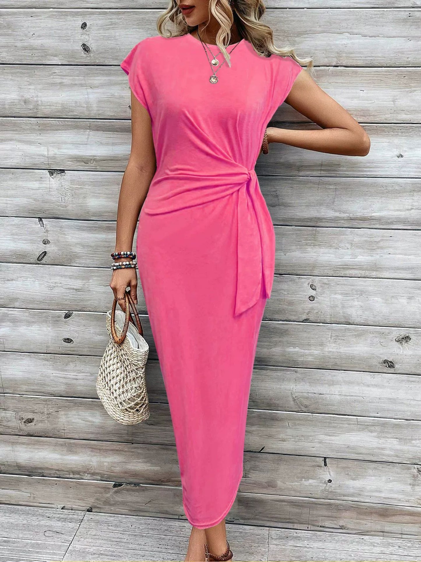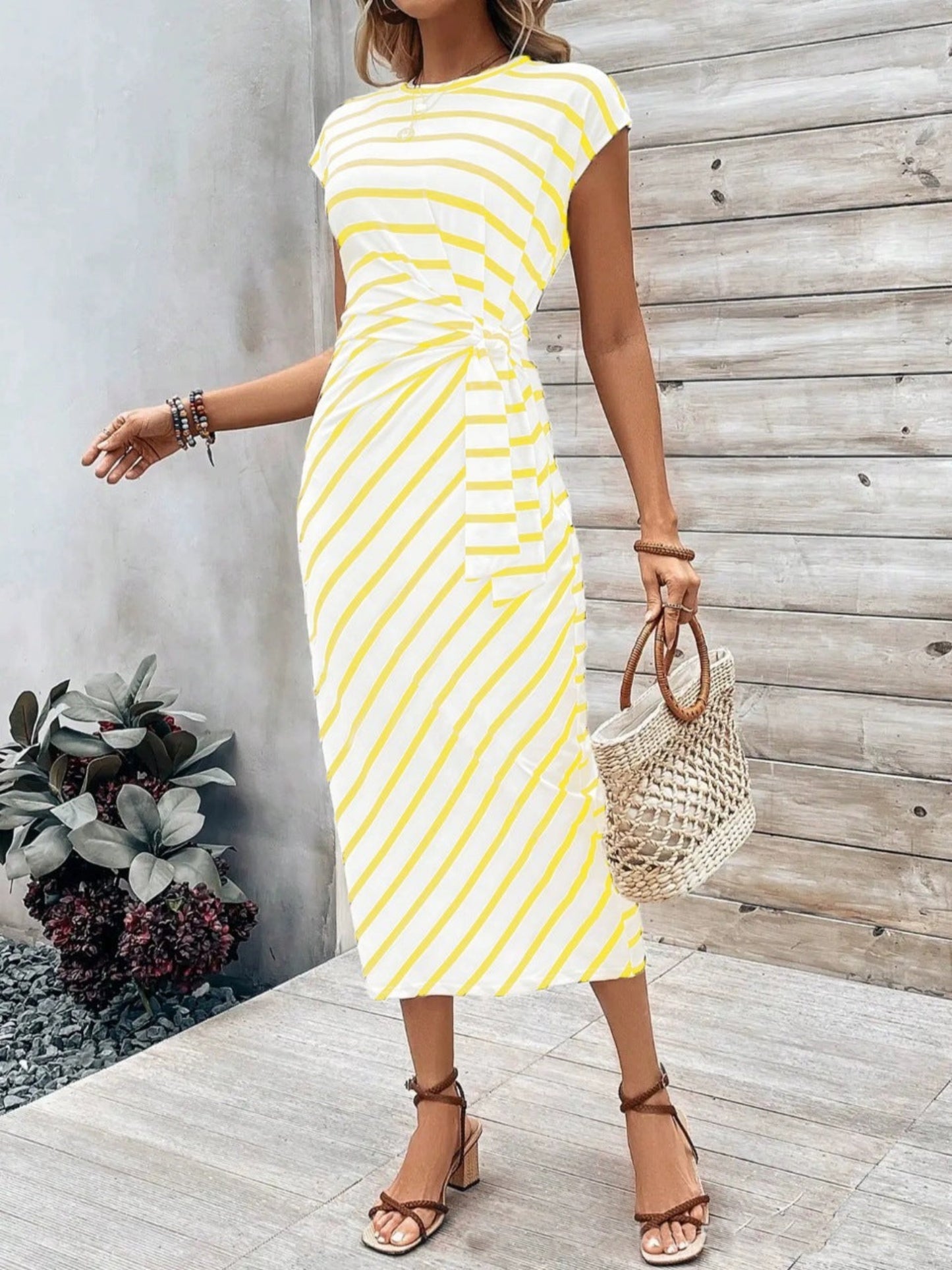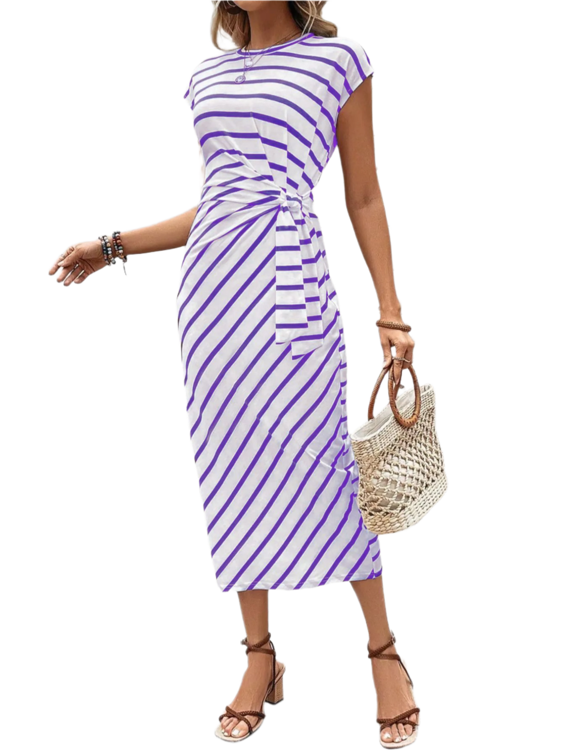 Elegant Waist Strap Striped Round Neck Short Sleeve And Long Pattern Dress